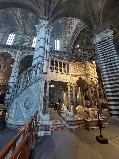 Sienska katedrala, ki so jo začeli graditi v 12. stoletju, je mojstrovina italijanske romansko-gotske arhitekture. Njeno glavno pročelje je bilo dokončano leta 1380 skupaj z ladjo, usmerjeno severovzhod – jugozahod. Zunanjost in notranjost sta zgrajeni iz belega in zelenkasto-črnega marmorja v izmeničnih črtah, z dodatkom rdečega kamna na fasadi. Tovrstna izbira kamna daje zlasti v notranjosti poseben pečat! Poleg tega je v katedrali, kar nekaj umetnin svetovno poznanih umetnikov, kot sta na primer gotska prižnica Nicola Pisana iz druge polovice 13. stoletja in Janez Krstnik, delo Donatella. Na tleh si boste lahko ogledali tudi mozaike, ki so bili izdelani med 14. in 16. stoletjem, najprej v tehniki sgrafitto in kasneje z inkustracijo marmorja.